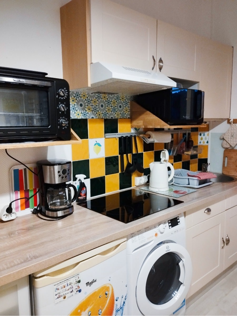 - Une petite cuisine pleine de ressources ! Vous y trouverez tout ce qu’il faut pour vous sentir comme à la maison : plaque 3 feux, four, micro-ondes, réfrigérateur « top » avec compartiment congélateur, lave-linge/sèche-linge, bouilloire, machine à café et Tassimo. Tout est prêt pour vos repas et vos moments de détente.